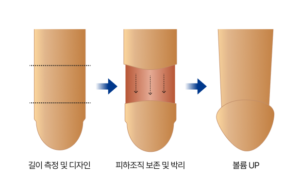 남겨진 피하조직을 귀두 뒤쪽으로 말아 고정함으로써 귀두 하부에 자연스러운 볼륨감을 형성하는 구조입니다. 출혈과 통증 부담을 줄이면서 귀두 라인을 또렷하게 정리하는 것을 목표로 합니다.