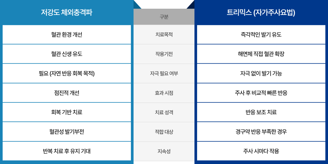 저강도 체외충격파 치료는 경구약 또는 자가주사요법과 병행 가능합니다.